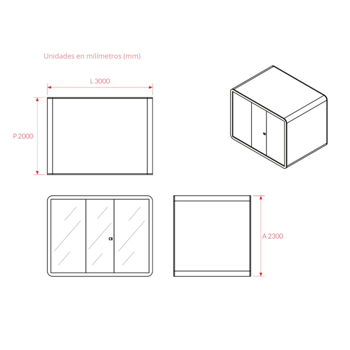 Este modelo viene en un único tamaño de 3000 mm de ancho x 2000 de profundidad y 2300 mm de altura. Es la más grande de su clase y puedes configurarla con diferentes colores exteriores e interiores, diferentes opciones de muebles y diferentes tipos de cierre (vidrio a ambos lados, vidrio solo a un lado y cerrado al otro, etc)